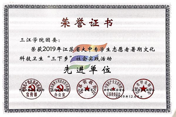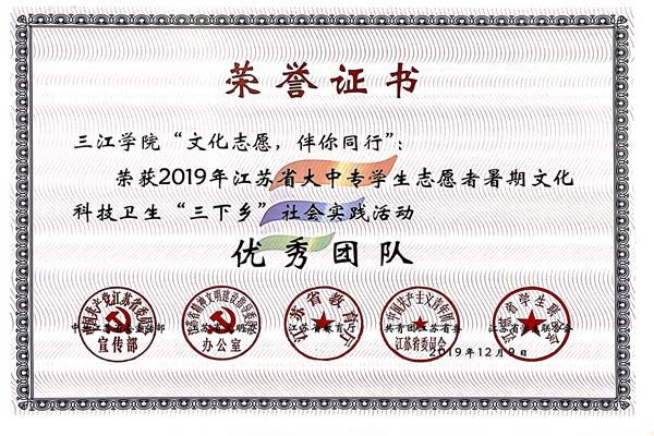 近日,省委宣传部、省文明办、省教育厅、团省委、省学联联合发文总结2019年江苏省大中专学生志愿者暑期文化科技卫生“三下乡”社会实践活动,对工作中表现突出单位、团队、个人等项目进行表彰。best365官方网站获得2019年全省暑期社会实践先进单位称号,同时获评2支优秀团队,1篇优秀调研报告,3名先进个人和2名先进工作者。
