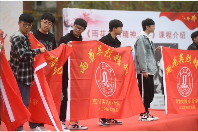 当天传承与研究系列活动共有六项内容:中国大学慕课(MOOC)《雨花英烈精神十讲》正式上线;校本教材、革命文化教材《雨花英烈精神十讲》出版仪式;雨花英烈精神研究院成立与揭牌仪式;雨花英烈精神大学生社会实践小分队授旗仪式;全体共产党员宣誓仪式; “三江讲堂”开设五场“雨花英烈精神”专项宣讲活动。