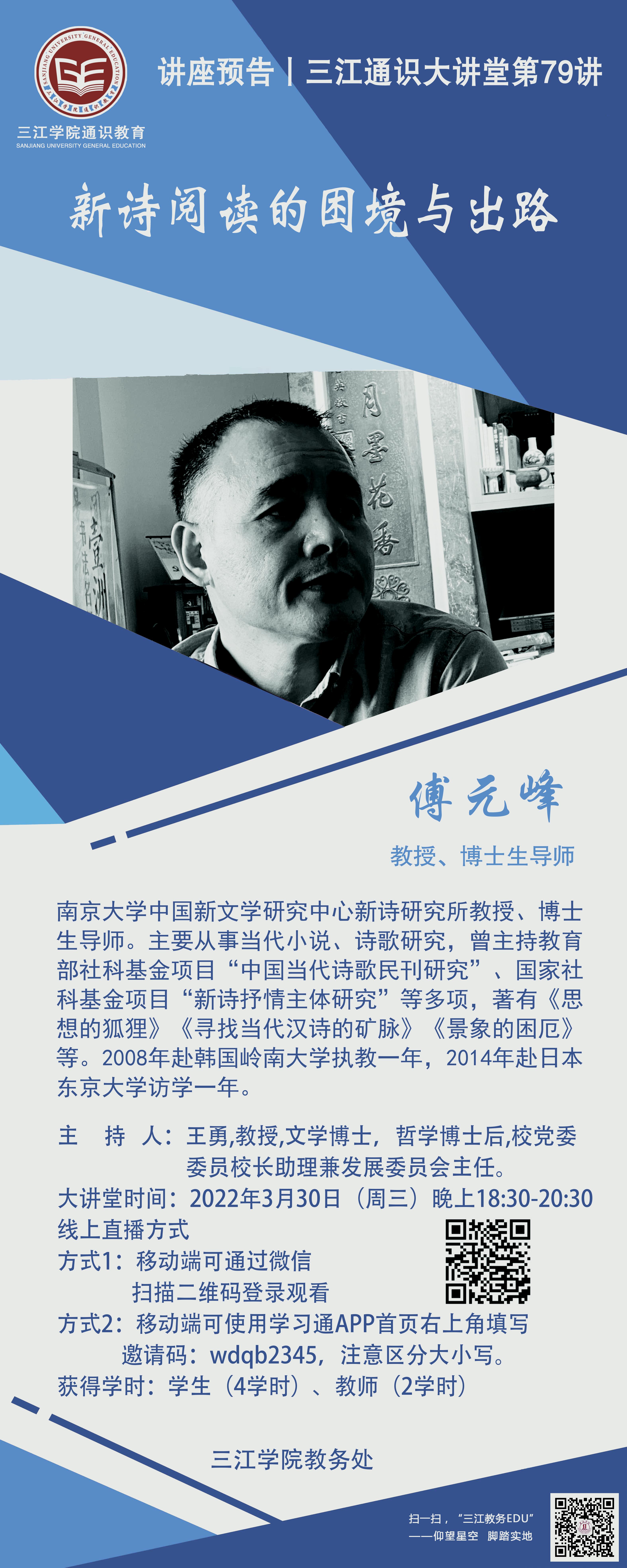 大讲堂专家:傅元峰,南京大学中国新文学研究中心新诗研究所教授、博士生导师。主要从事当代小说、诗歌研究,曾主持教育部社科基金项目“中国当代诗歌民刊研究”、国家社科基金项目“新诗抒情主体研究”等多项,著有《思想的狐狸》《寻找当代汉诗的矿脉》《景象的困厄》等。2008年赴韩国岭南大学执教一年,2014年赴日本东京大学访学一年。