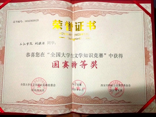 大一的暑假,因为对文学的热爱,他抱着试试看的心态参加了全国大学生文学知识竞赛,并且取得了国赛特等奖的好成绩。