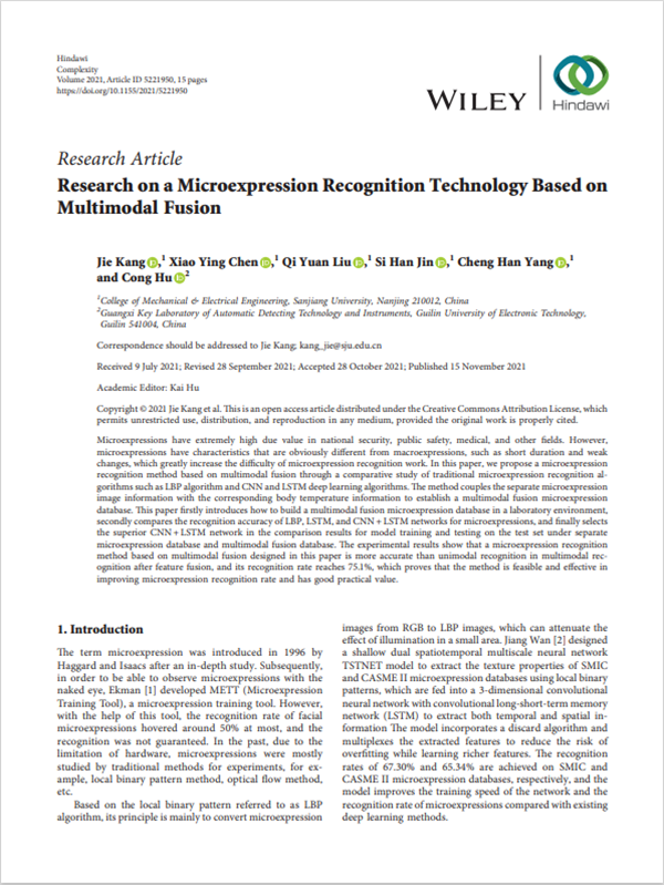 在刘骐源进入实验室后参加的几场比赛中,他渐渐发现自己对计算机视觉识别方面很感兴趣。恰好在2021年的四月份,实验室的指导老师康杰老师准备做一项基于多模态融合的微表情识别技术研究,刘骐源主动报名组队,跟着老师一起来完成这篇论文。