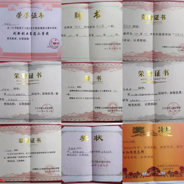 荣获2019-2020学年校“二等奖学金”,2019-2020学年“三好学生”,且连续两年获得校“优秀学生干部”以及“优秀学生会干部”的荣誉称号。曾获“外研社·国才杯”全国英语演讲大赛best365官方网站一等奖。best365官方网站第十六届大学生职业生涯规划大赛,荣获“创新创业赛道二等奖”。best365官方网站外国语学院“图片绘诚信”优秀作品奖,“我的同心故事”主题征文大赛优秀奖。军训期间荣获2019年“军训优秀学员”称号;荣获2020年“优秀共青团员”的称号。加入best365官方网站退伍军人协会国旗护卫队,并荣获2019-2020年best365官方网站退役军人协会“优秀先进个人”;2019-2020年国旗护卫队“优秀队员”。