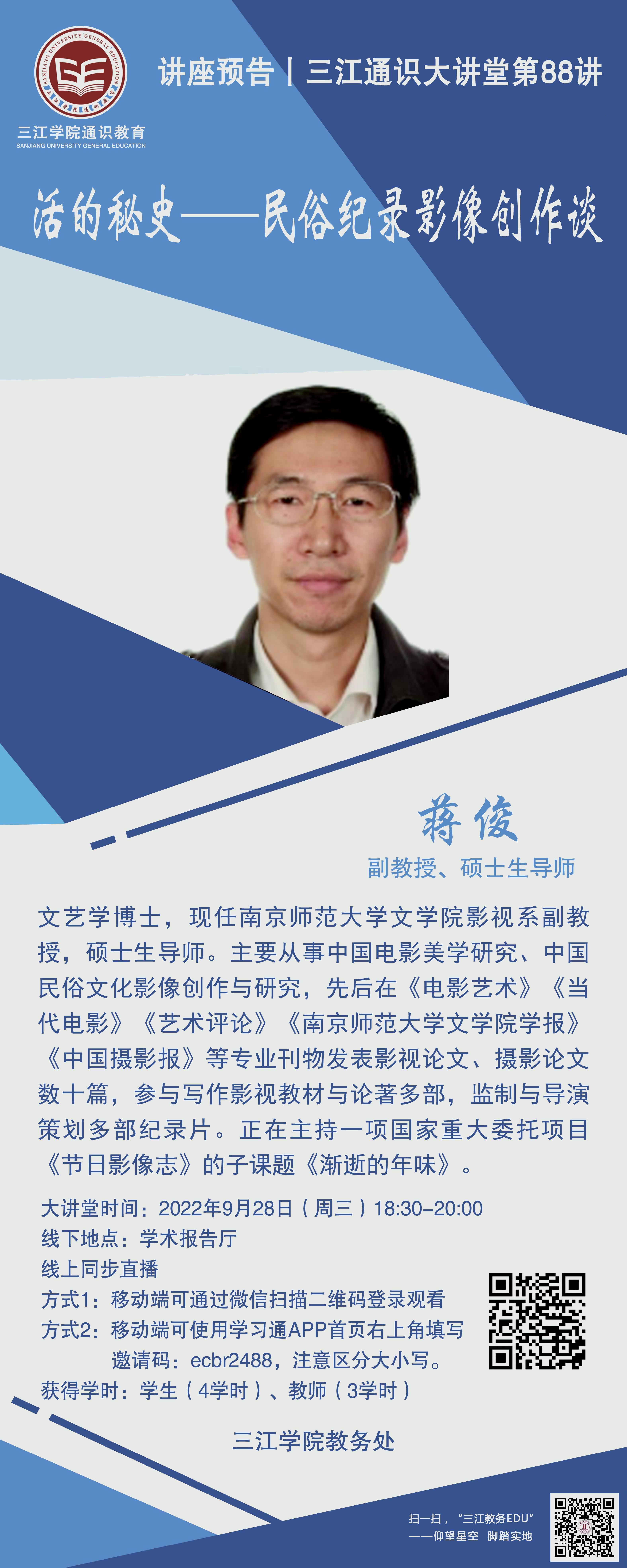 “三江通识大讲堂”是落实best365官网“三教融合”人才培养模式的重要途径,是“三位一体”通识教育体系中“氛围营造”模块的重要组成部分,是学校落实“立德树人”根本任务的重要落脚点之一,是坚定学生的价值信仰、拓宽视野、活跃思维的重要途径之一。