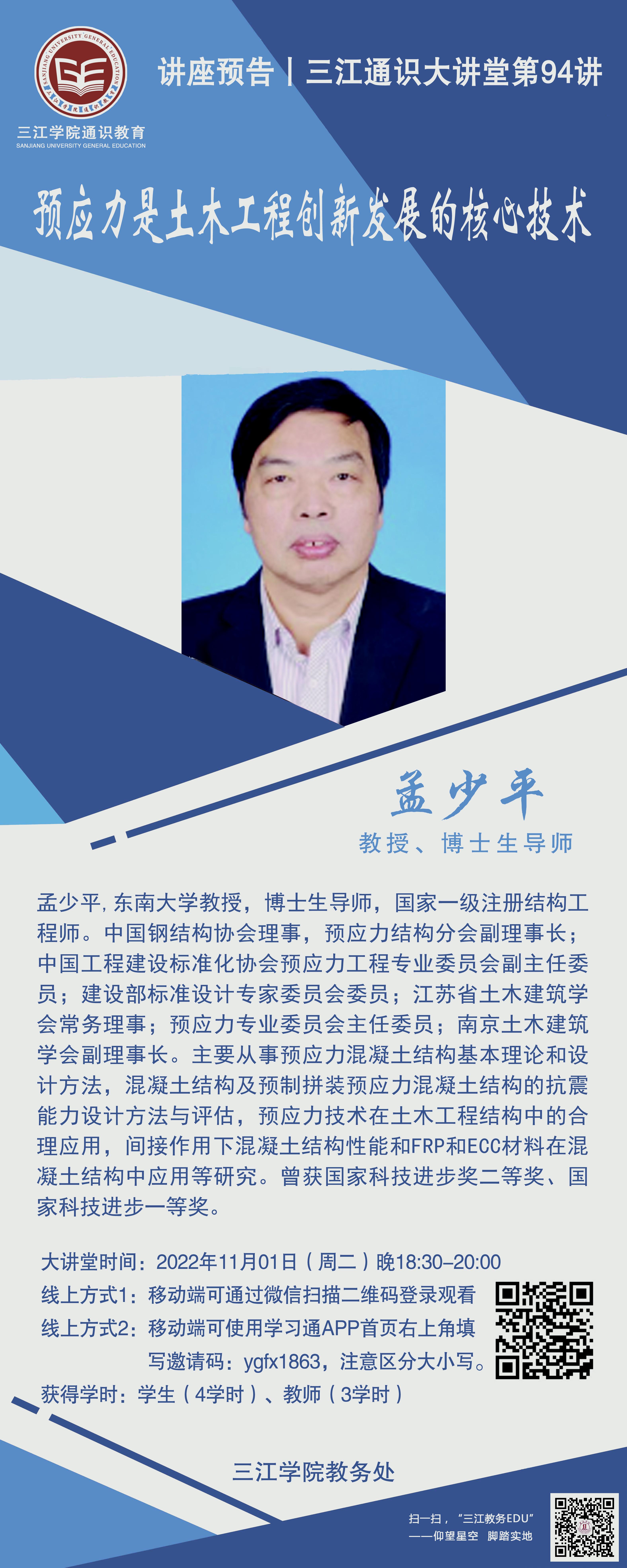 大讲堂专家:孟少平,教授,东南大学结构工程与桥梁工程博士生导师,国家一级注册结构工程师。主要从事预应力混凝土结构基本理论和设计方法,混凝土结构及预制拼装预应力混凝土结构的抗震能力设计方法与评估,预应力技术在土木工程结构中的合理应用,间接作用下混凝土结构性能和FRP和ECC材料在混凝土结构中应用等方向研究。相应的研究成果分别获得1998年国家科技进步奖二等奖和2014年国家科技进步一等奖。担任的主要学术职务有:中国钢结构协会理事,预应力结构分会副理事长。中国工程建设标准化协会预应力工程专业委员会副主任委员。建设部标准设计专家委员会委员。江苏省土木建筑学会常务理事,预应力专业委员会主任委员。南京土木建筑学会副理事长。