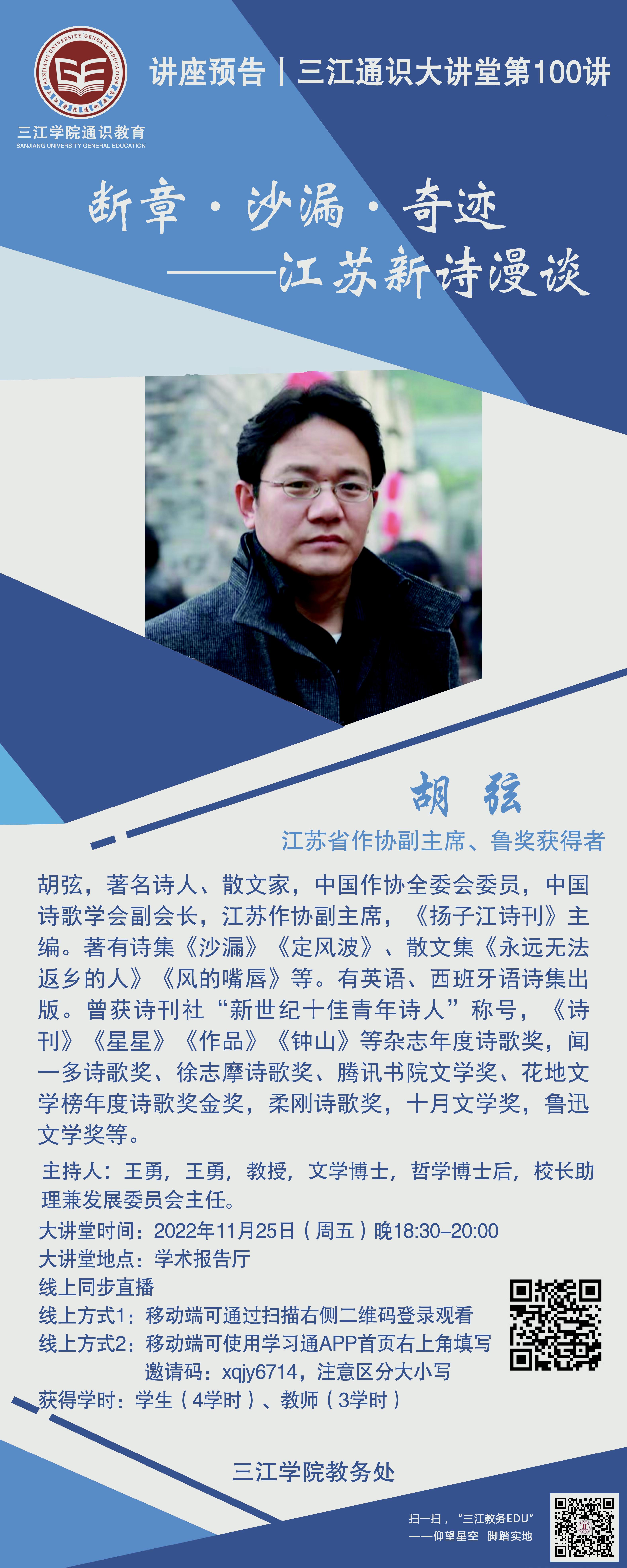 大讲堂专家:胡弦,著名诗人、散文家,中国作协全委会委员,中国诗歌学会副会长,江苏作协副主席,《扬子江诗刊》主编。著有诗集《沙漏》《定风波》、散文集《永远无法返乡的人》《风的嘴唇》等。有英语、西班牙语诗集出版。曾获诗刊社“新世纪十佳青年诗人”称号,《诗刊》《星星》《作品》《钟山》等杂志年度诗歌奖,闻一多诗歌奖、徐志摩诗歌奖、腾讯书院文学奖、花地文学榜年度诗歌奖金奖,柔刚诗歌奖,十月文学奖,鲁迅文学奖等。