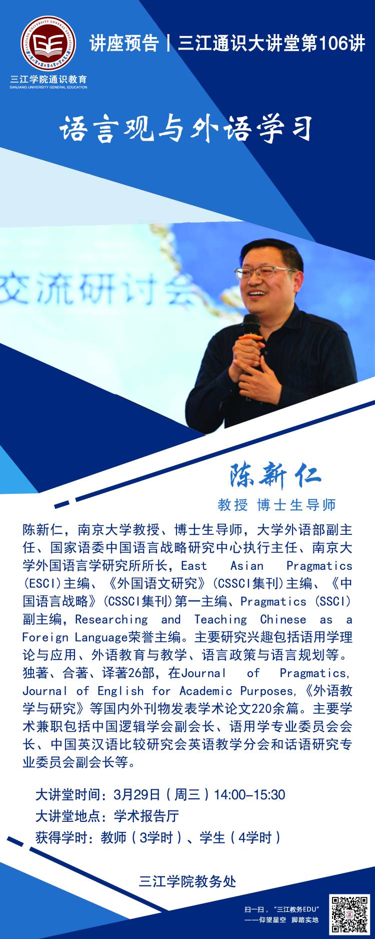 大讲堂专家:陈新仁,南京大学教授、博士生导师,大学外语部副主任、国家语委中国语言战略研究中心执行主任、南京大学外国语言学研究所所长,East Asian Pragmatics (ESCI)主编、《外国语文研究》(CSSCI集刊)主编、《中国语言战略》(CSSCI集刊)第一主编、Pragmatics (SSCI)副主编,Researching and Teaching Chinese as a Foreign Language荣誉主编。独著、合著、译著26部,在Journal of Pragmatics, Journal of English for Academic Purposes,《外语教学与研究》等国内外刊物发表学术论文220余篇。主要学术兼职包括中国逻辑学会副会长、语用学专业委员会会长、中国英汉语比较研究会英语教学分会和话语研究专业委员会副会长等。