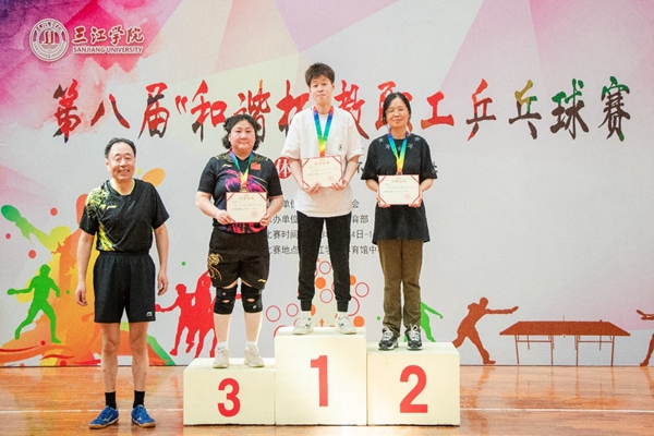 经过两天精彩又激烈的比赛,机关联队夺得混合团体赛桂冠,机械与电气工程学院获得第二名,外国语学院获得第三名,艺术学院、体育部、电子信息工程学院分别获得第四名至第六名。个人单打赛土木工程学院郭汉丁老师获得男单冠军,体育部肖路遥老师获得女单冠军;党委书记封超年获得男单亚军、图书馆徐爱珍老师获得女单亚军;党委办公室曹立明老师、计算机科学与工程学院赵婧老师分别获得男单、女单季军。