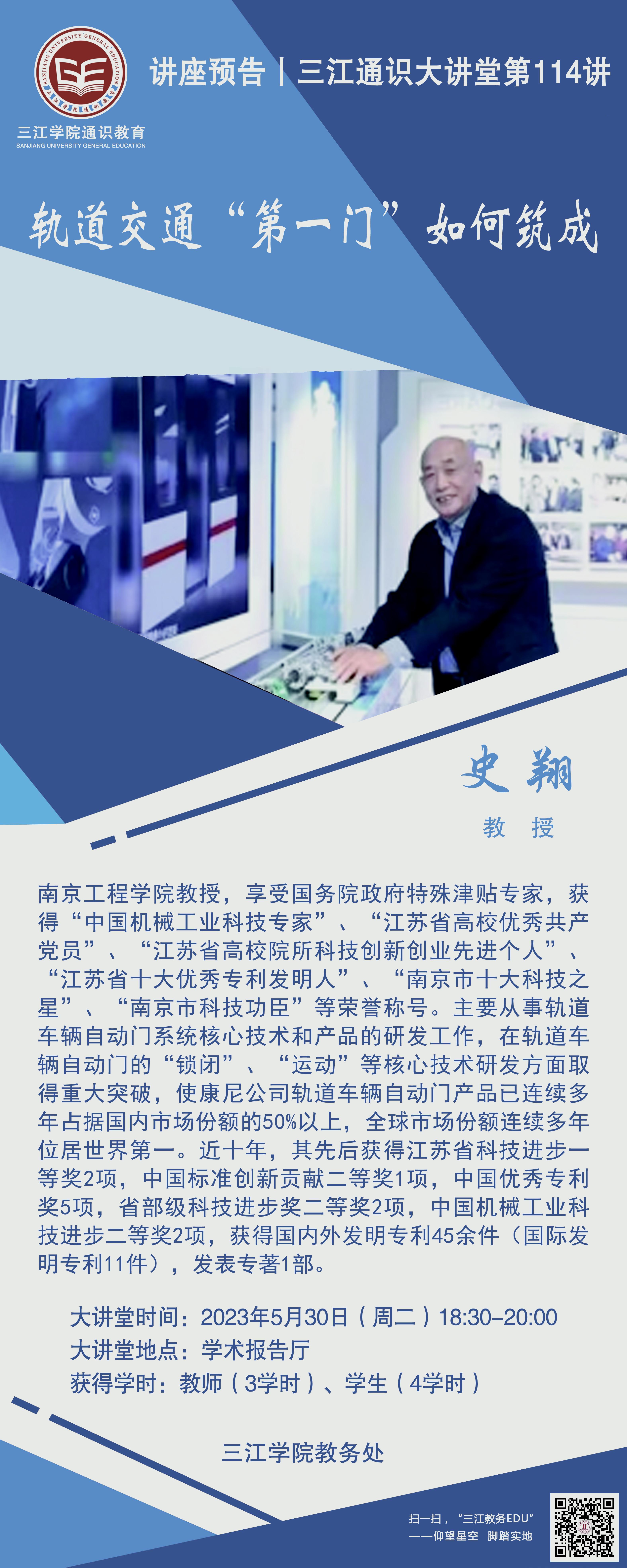 大讲堂专家:史翔教授,南京工程学院教授,享受国务院政府特殊津贴专家,获得“中国机械工业科技专家”、“江苏省 高校优秀共产党员”、“江苏 省高校院所科技创新创业先进个人”、“江苏省十大优秀专利发明人”、“南京市十大科技之星”、“南京市科技功臣”等荣誉称号。主要从事轨道车辆自动门系统核心技术和产品的研发工作,在轨道车辆自动门的“锁闭”、“运动”等核心技术研发方面取得重大突破,使康尼公司轨道车辆自动门产品已连续多年占据国内市场份额的50%以上,全球市场份额连续多年位居世界第一。近十年,其先后获得江苏省科技进步一等奖2项,中国标准创新贡献二等奖1项,中国优秀专利奖5项,省部级科技进步奖二等奖2项,中国机械工业科技进步二等奖2项,获得国内外发明专利45余件(国际发明专利11件),发表专著1部。