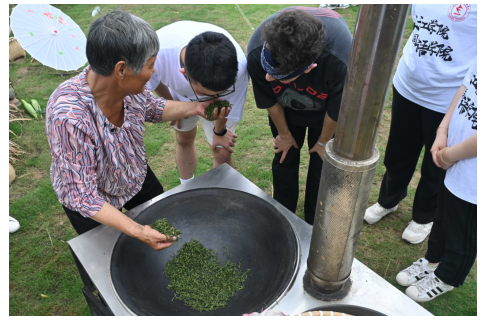 活动现场,留学生与外国语学院学子一同下田采茶。“一芯一叶” “两叶一芯”,他们按照农艺师傅传授的采摘技巧,熟练地将茶叶采摘到背篓里。杀青、揉捻、干燥,当地茶农用几十年如一日的手法为中外学子展示了制茶的全过程。大家对中国传统的土灶炒茶方法赞不绝口。
