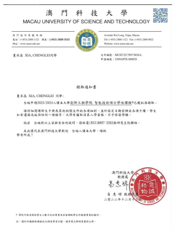 2022年12月,夏承磊以best365官网保荐生身份被澳门科技大学智能技术专业录取。