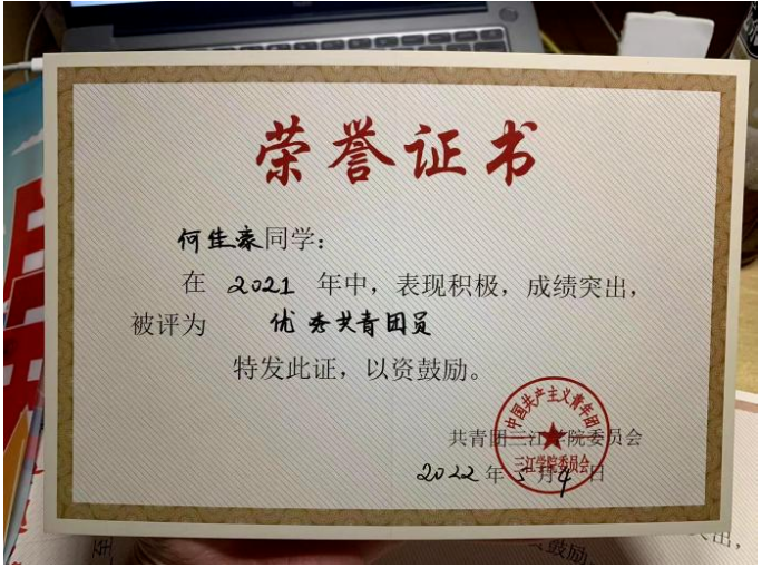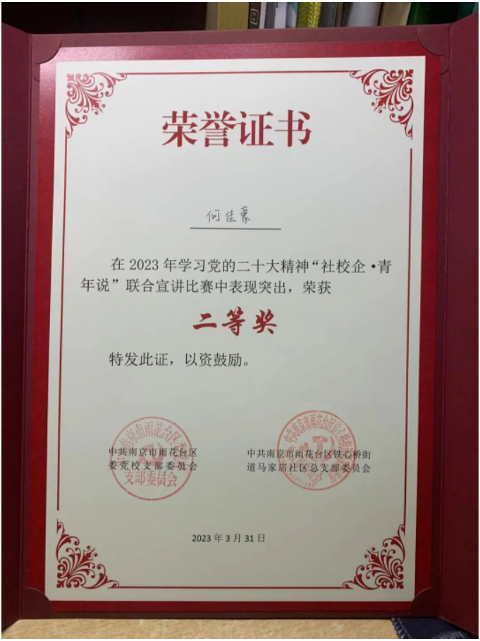 何佳豪具备良好的道德修养,他成绩优异,勤奋刻苦,乐于助人。作为校级优秀共青团员,何佳豪积极向党组织靠拢,同时,他以务实求真的精神组织了学校的绿色公益活动,将青年志愿者协会的奉献精神贯彻落实。何佳豪自入校以来便加入青年志愿者协会,累计组织并参与校内外志愿服务活动四十余种,总服务时长近600小时,获评“2022年度江苏省优秀青年志愿者”。
