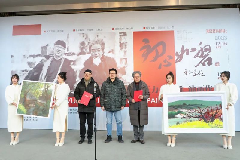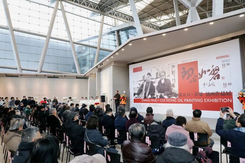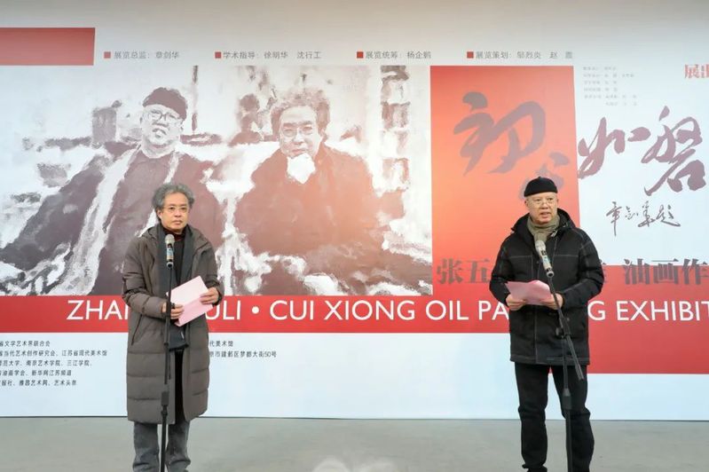 12月16日上午,伴随着今年冬天南京的第一场瑞雪,由江苏省文联主办,江苏省当代艺术创作研究会、江苏省现代美术馆承办的“初心如磐——张五力•崔雄油画作品展”在江苏省现代美术馆开幕。展览展出了画家张五力、崔雄的150余幅油画作品。