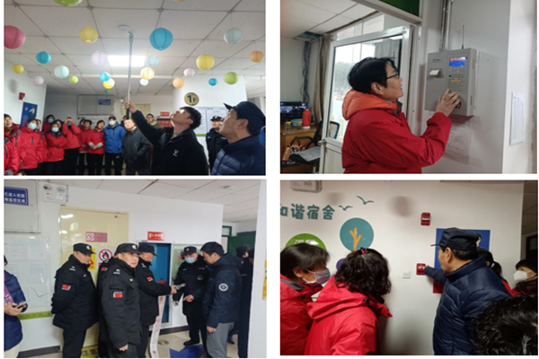 与会人员在学生公寓1号楼参加实操培训,演练应急处置流程,模拟突发火情,烟感、消防主机报警后,各岗位工作人员积极有效应对。丁铸老师和维保单位工作人员就如何使用喊话器、灭火器、手动报警器、室内消火栓、安全门如何开等进行了详细的实操培训,现场多位宿管、安保人员认真学习并进行了实践演习。