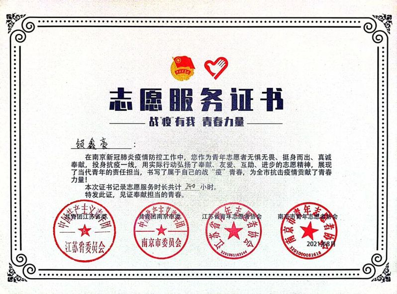 虽然平时的学习生活比较忙碌,但锁鑫豪也会充分利用有限的时间,积极参加校内外的各种活动,累计志愿服务时长240小时。在校外他曾参加江苏省“三下乡”大学生志愿者暑期社会实践活动、当过南京市疫情防控志愿者,在校内参加过“三行诗”比赛、种地实践活动……最令他印象深刻的是参加“三下乡”活动期间,宣传垃圾分类时与小朋友们的交流、小组成员间共同协作完成了三张海报的设计工作。面对小江的采访,锁鑫豪说:“在帮助他人的时候,其实也是对自己的一种锻炼,享受过程中的互帮互助,做自己想做的事,只要做到不后悔。”他积极合理的利用当下的每一分每一秒,不断勇攀高峰,实现自己最大价值。
