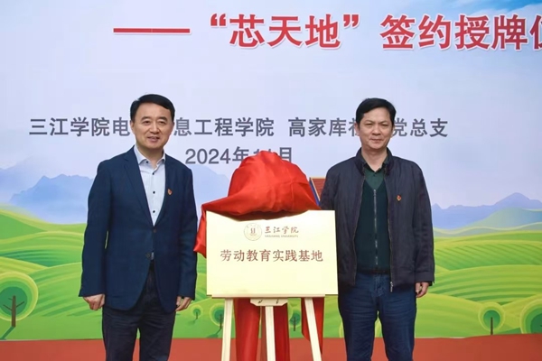 周更生与袁克思共同为“芯天地”揭牌。校学生发展与服务中心主任周学军与铁心桥街道高家库社区党总支书记、居委会主任彭健林共同签订劳动教育共建协议。电子信息工程学院党总支戴浩书记介绍了“芯天地”实践基地劳动教育活动开展的情况。