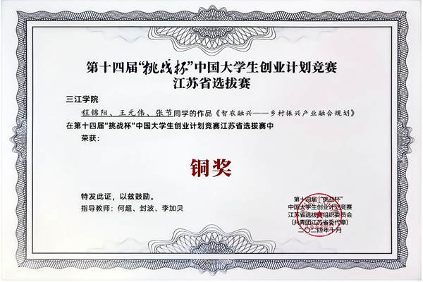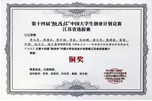 近日,共青团江苏省委、江苏省教育厅、江苏省人力资源和社会保障厅、江苏省科学技术协会和江苏省学生联合会对共同主办的第十四届“挑战杯”中国大学生创业计划竞赛江苏省选拔赛获奖项目进行了表彰,best365官网报送的《钢铁卫士-环保型无机防腐涂料的制备及产业化》、《智农融兴--乡村振兴产业融合规划》2件作品喜获省级铜奖。