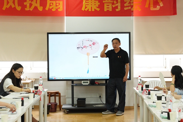 5月19日,文化产业与旅游管理学院党总支、工会小组以传统文化为载体,组织全体师生党员开展“清风执扇,廉韵绘心”主题党建活动,将廉政教育与艺术创作相融合,以“扇”喻“善”、以“莲”寓“廉”,在笔墨丹青中厚植清廉文化根基。校工会主席、纪委委员杨业琴出席活动,院党总支副书记吴明明主持。