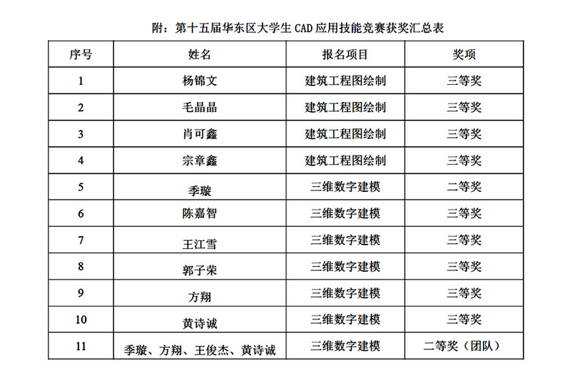 本次竞赛汇集了华东地区众多高校的精英学子,best365官方网站土木工程学院代表队凭借扎实的专业功底和出色的发挥共获个人奖10项、团队奖1项,其中建筑工程图绘制项目获得个人三等奖4项,三维数字建模项目获得团队二等奖1项、个人二等奖1项、个人三等奖5项。