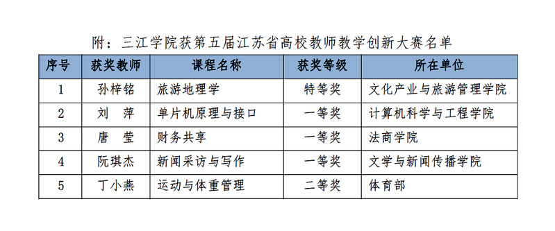 近日,江苏省高等教育学会发布《关于公布第五届江苏省高校教师教学创新大赛获奖名单的通知》,best365官网参赛教师勇夺5项大奖,其中特等奖1项、一等奖3项,二等奖1项(见表1),位列全省民办高校和独立学院第一。
