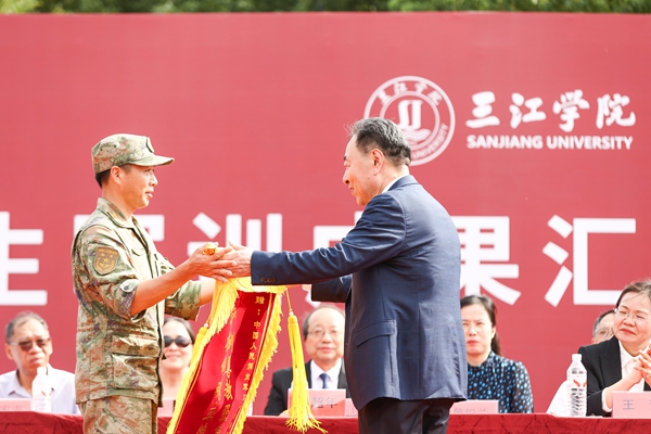理事长、党委书记封超年代表学校向承训部队赠送锦旗