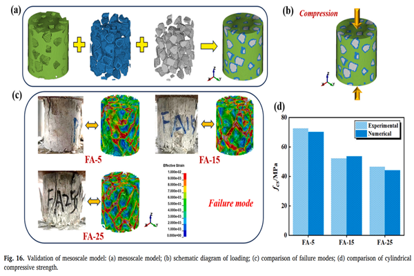 李涛老师作为第一作者的研究论文《Experimental and 3D mesoscopic failure mechanism investigation on the uniaxial compressive mechanical behavior of MPCC with different fly ash contents》,系统研究了三种不同粉煤灰掺量对高强MPCC单轴压缩力学性能的影响,并建立了相应的单轴应力-应变本构关系。研究同时采用三维细观混凝土模型对试验结果进行了验证,深入分析了材料在受力过程中的裂纹扩展行为与破坏机理,为MPCC在实际工程中的应用与结构设计提供了重要依据。本研究获2023年江苏省教育厅“青蓝工程”项目、国家自然科学基金(No. 52378265)及江苏省科技厅产学研合作项目(No. BY20230655)资助。