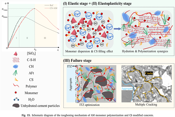 徐洁老师作为第一作者的研究论文《Synergistic acrylamide (AM) in-situ polymerization and wollastonite whisker (CS) modification towards multi-scale toughness enhancement in cement paste, mortar, and concrete》,提出了一种基于丙烯酰胺(AM)原位聚合与硅灰石晶须(CS)协同增强水泥基材料韧性的创新方法。研究显示,该协同改性策略可显著提升水泥净浆、砂浆及混凝土的抗弯性能与断裂能,同时抗压强度未见明显降低。机理分析表明,AM原位聚合形成的有机交联结构可强化水化产物界面,缓解应力集中;CS则有效填充孔隙、密实基体,二者协同作用显著改善了界面过渡区性能,为开发高强高韧水泥基材料提供了新途径。本研究获中央高校基本科研业务费(No. 2242025K30012)及东南大学至善青年学者支持计划(No. 2242023R40045)资助。