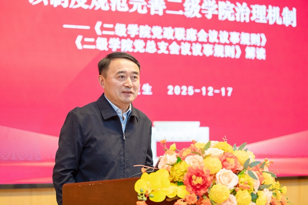 校党委常务副书记、副校长周更生以“制度规范完善二级学院治理机制——《二级学院党政联席会议议事规则》《二级学院党总支会议议事规则》解读”为题作专项报告。报告就深刻认识制定出台“两个议事规则”的重要意义、准确把握“两个议事规则”的主要内容、执行“两个议事规则”的注意事项、二级学院科学决策的关键要素四个方面进行了深入解读。