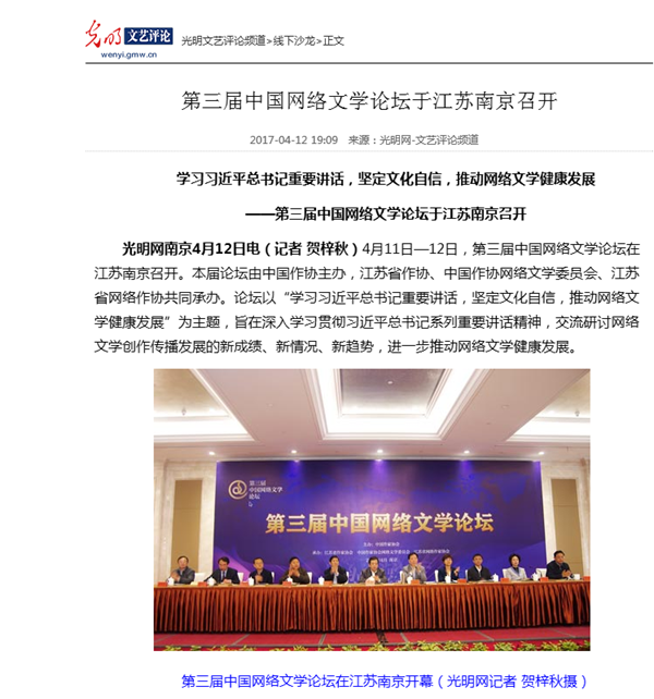 光明网:第三届中国网络文学论坛于江苏南京召开