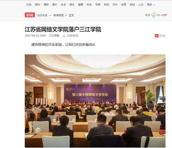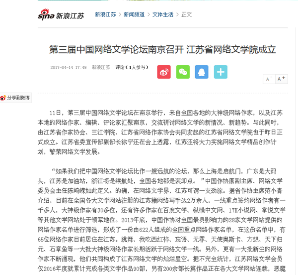 新浪网:《第三届中国网络文学论坛南京召开 江苏省网络文学院成立》