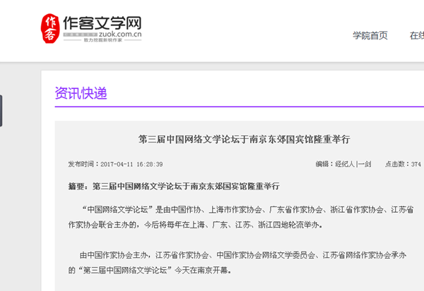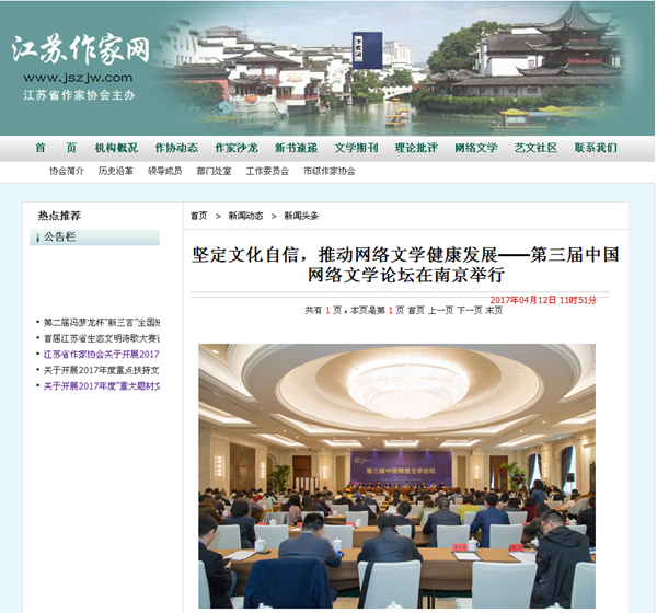 江苏作家网:《第三届中国网络文学论坛在南京举行》
