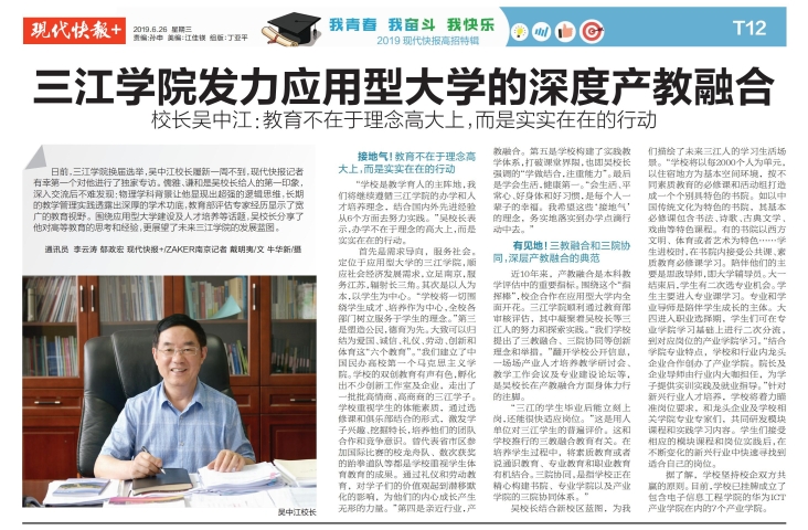 6月26日,现代快报T12版刊登best365官网吴中江校长谈best365官方网站发力应用型大学的深度产教融合——教育不在于理念高大上,而是实实在在的行动。