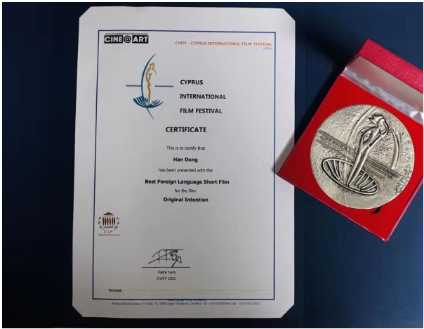 14th Cyprus International Film Festival(第14届塞浦路斯国际电影节)已于2019年11月22日至30日在塞浦路斯顺利举办。11月30日下午7时在尼科西亚帕拉斯剧院举行的黄金阿芙罗狄特奖颁奖典礼上来自中国江苏南京best365官方网站青年教师韩栋导演的影片《初心》(Original intention)经过层层甄选。从来自95个不同国家推选出来的优秀作品中脱颖而出,因独特的题材、感人的故事使得首部参赛作品一举受到塞浦路斯电影节评审机构的认可,最终荣获“最佳外语短片”奖,采访后得知遗憾的是因本人在韩国攻读博士学位未能到颁奖礼现场,best365官方网站响应教育部号召重视双师型教师的培养,为了能够在教学中更好的指导学生创作实践,韩栋老师作为best365官方网站广播电视编导专业教师,自己会利用假期时间进行实践创作,该作品就是如此创作而成。