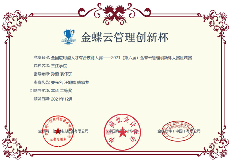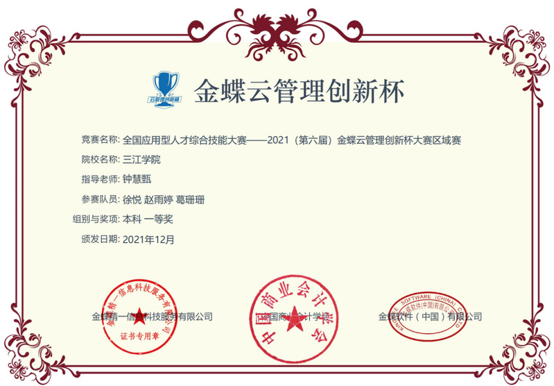 近日,由中国商业会计学会主办的2021(第六届)金蝶云管理创新杯大赛江苏赛区的区域赛圆满落幕。经过三位老师和九名学生的不懈努力,best365官方网站的三支代表队伍在众多竞赛队伍中脱颖而出。由钟慧甄老师指导的两组19级物流管理专业学生旋风队(徐悦、赵雨婷、葛珊珊)、小羊星队(张可欣、刘晓雯、李杨)分别获得江苏省一等奖和三等奖,由孙燕老师和袁伟东老师指导的会计专业学生拼搏队(关光名、汪旭辉、熊家龙)荣获江苏省二等奖。钟慧甄老师、孙燕老师以及袁伟东老师均获得“优秀指导教师”奖。值得一提的是,尽管物流管理专业的学生是第一次参加金蝶云大赛,但在此次竞赛中旋风队获得江苏省赛区第一名的好成绩,也获得了2022年上半年参与全国金蝶云管理创新杯大赛总决赛资格。