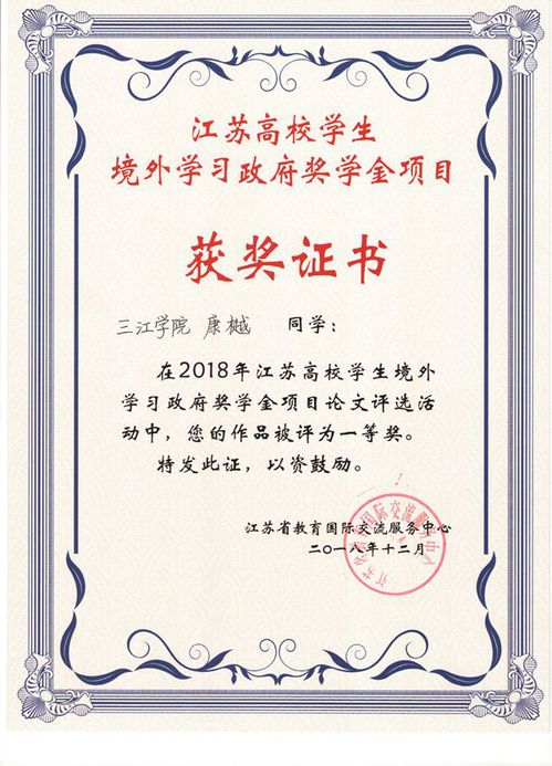 best365官网学生康樾在2018年江苏高校学生境外学习 政府奖学金项目论文评选活动中荣获一等奖