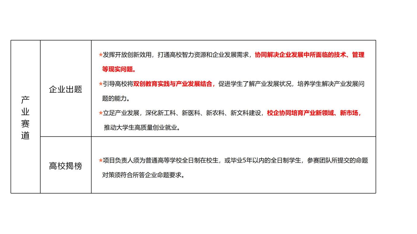 3.产业命题赛道。以企业命题、高校答题的方式进行。聚焦发展新质生产力,立足产业急需,深化新工科、新医科、新农科、新文科建设,校企协同培育产业新领域、新市场,推动大学生更高质量创业就业。