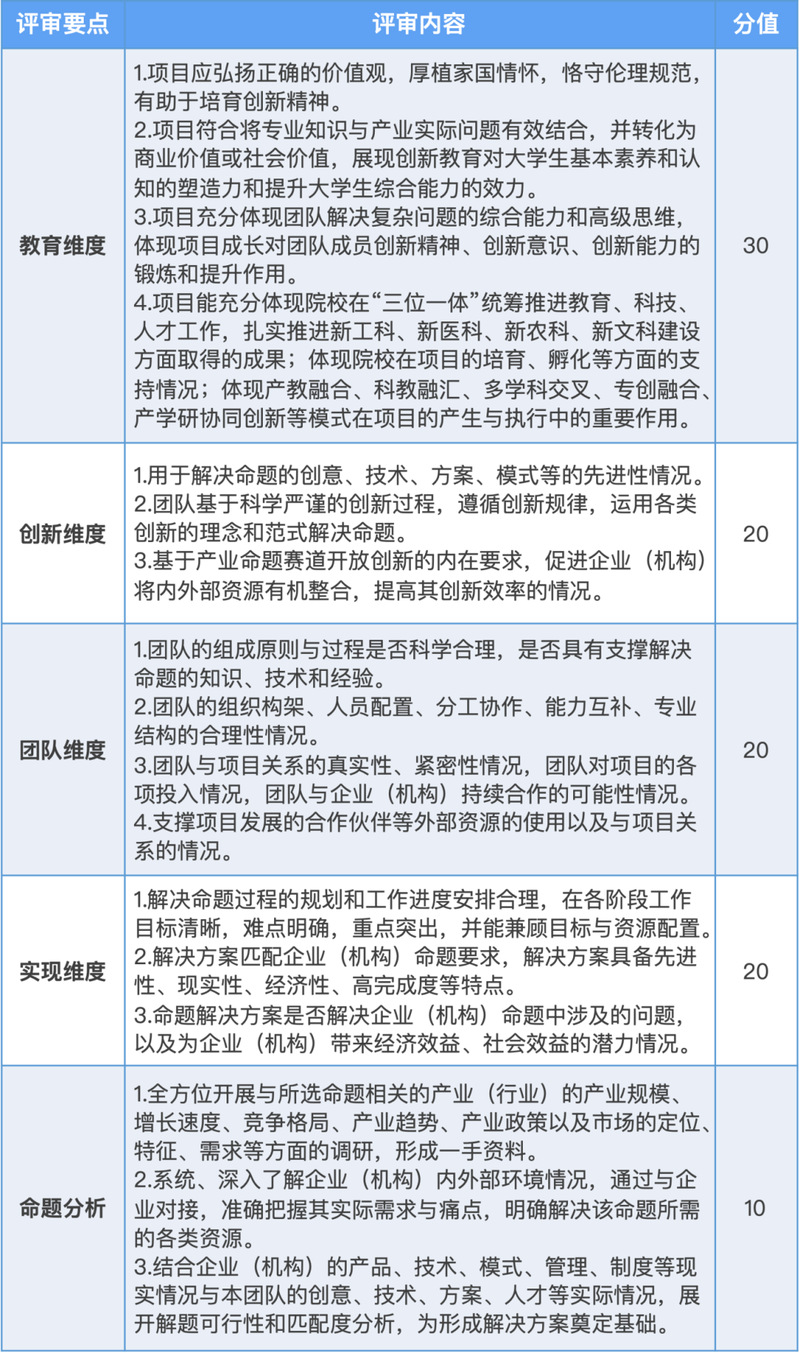 2.本赛道针对企业开放创新需求,面向产业代表性企业、行业龙头企业、专精特新企业等征集命题。高校团队根据企业命题揭榜并出具解决方案,加强产学研深度融合。大赛组委会已公布产业命题赛道入围命题名单(附件1)。各个命题的详细材料可于即日起登录“全国大学生创业服务网”(网址:cy.ncss.cn)查询。产业赛道评审规则见下图。