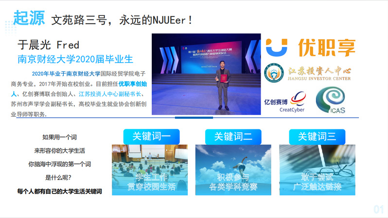 本次讲座邀请了江苏投资人中心副秘书长于晨光,从科技前沿到社会公益,从商业模式创新到文化产业的深耕,聆听关于梦想、勇气、坚持与智慧的故事,感受创业路上的酸甜苦辣,学习如何在未知中寻找机遇,在挑战中激发潜能。