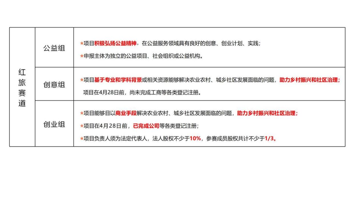 2.“青年红色筑梦之旅”赛道(以下简称“红旅赛道”)。红旅赛道参赛项目应符合大赛参赛项目要求,同时在推进农业农村、城乡社区经济社会发展等方面有创新性、实效性和可持续性。
