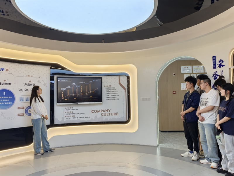 在南京强思数字科技董事、副总裁杨一曦的陪同下,同学们首先参观了公司展厅。作为2010年创立于南京大学科技园的国家高新技术企业,强思数字科技凭借在数字孪生技术领域的深耕,已成为江苏省专精特新企业代表。杨总详细介绍了公司自主研发的工业元宇宙平台X-Twins,该平台实现了从智能建造到智能制造的全流程覆盖,让抽象的“数字孪生”概念变得触手可及。展厅内实时展示的智能工厂应用案例,让同学们直观感受到科技赋能工业生产的巨大潜力。