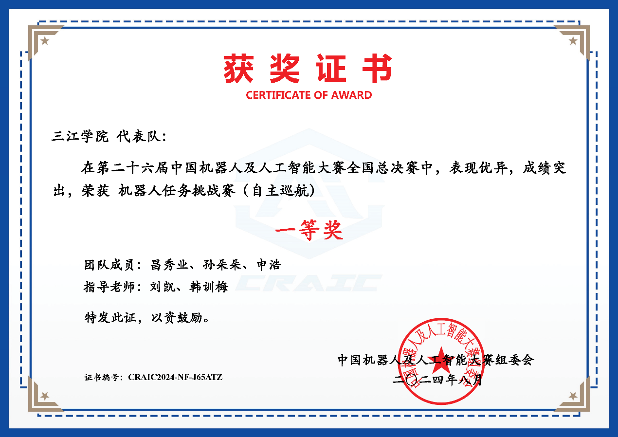 1 | 机器人任务挑战赛(自主巡航) | 昌秀业、孙朵朵、申浩 | 刘凯、韩训梅 | 一等奖 |