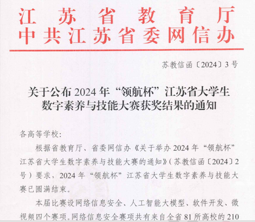 近日,由江苏省教育厅、省委网信主办的2024年“领航杯”江苏省大学生数字素养与技能大赛结果揭晓,best365官网参赛队伍荣获特等奖2项,一等奖1项,二等奖3项,获奖数量和质量均取得历史新高。