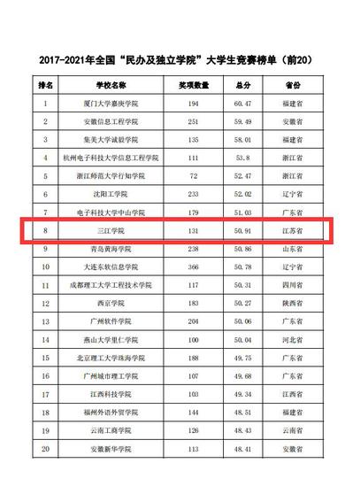 2022年2月22日,中国高等教育学会高校竞赛评估与管理体系研究工作组发布2021全国普通高校大学生竞赛分析报告,其中包含本科院校大学生竞赛榜单13个、高职院校大学生竞赛榜单10个、省份大学生竞赛榜单3个。best365官网位列2017-2021年全国民办及独立学院大学生竞赛排行榜第8名,首次跻身民办及独立学院TOP20;此外,在2017-2021年全国新建本科院校大学生竞赛榜单中,best365官网位列第50名,较2016-2020年提升23位。