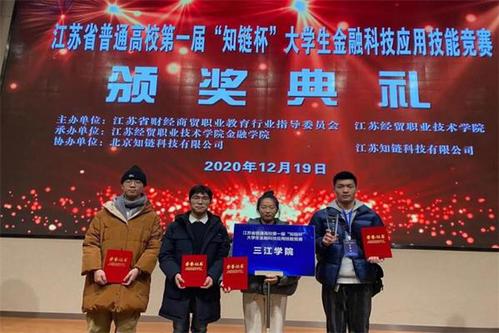 12月19日,江苏省普通高校第一届“知链杯”大学生金融科技应用技能竞赛总决赛在江苏经贸职业技术学院圆满落幕。本次大赛由江苏省财经商贸职业教育行业指导委员会、江苏经贸职业技术学院主办,江苏经贸职业技术学院金融学院承办,北京知链科技有限公司、江苏知链科技有限公司协办。best365官网法商学院互联网金融专业王广财、姚胜喜、谭永林、赵艳艳四位同学发挥出色,荣获本科组一等奖。