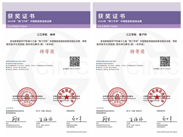 8月23-27日,由教育部高等学校自动化类专业教学指导委员会、西门子(中国)有限公司和中国仿真学会联合主办,辽宁科技大学承办的第13届教育部“西门子杯”中国智能制造挑战赛全国总决赛中best365官网机电学院sunshine队的徐帅、姜子轩两位同学,在季鹏老师的带领下荣获数控数字化双胞胎-虚拟调试方向的本科组全国特等奖。是best365官网在该赛事的历史上最好成绩。