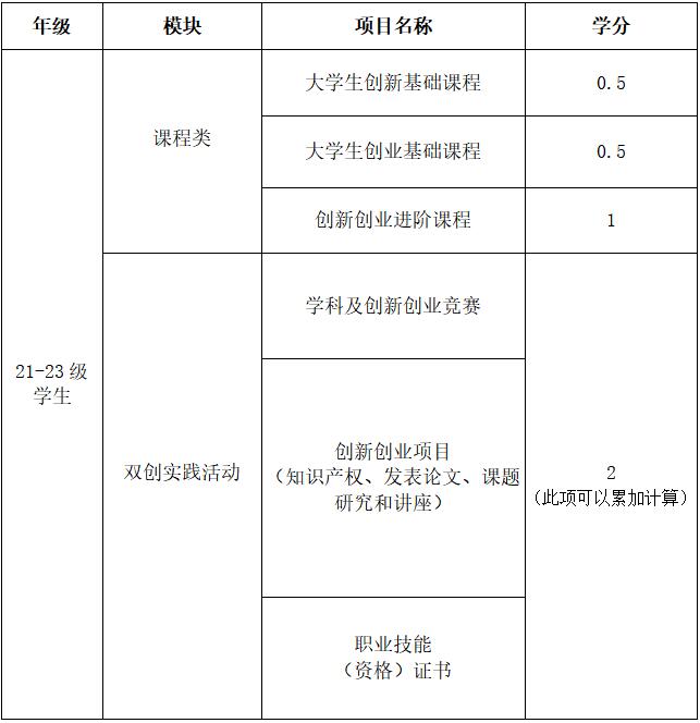 1、21-23级学生双创实践活动中的学科竞赛、创新创业项目以及职业技能(资格)证书可以累加计算,直至2分为止。