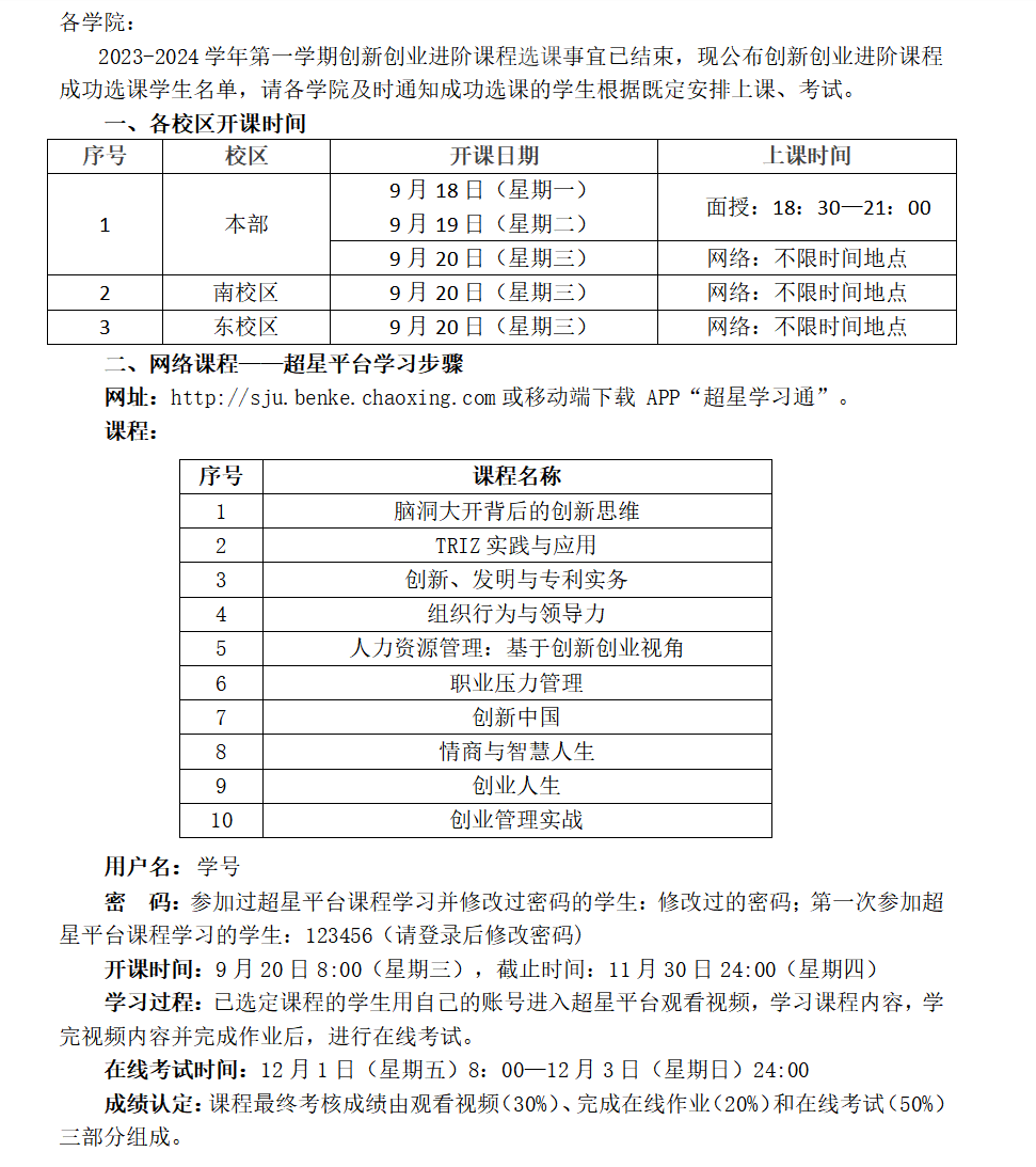 关于2023-2024学年第一学期创新创业进阶课程上课的通知