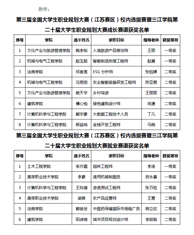 经过院赛、校赛书面评审与现场决赛的激烈角逐,本届职业规划大赛获奖名单正式揭晓。比赛共评选出成长赛道一等奖2名、二等奖6名、三等奖8名、优秀奖10名;就业赛道一等奖2名、二等奖4名、三等奖6名、优秀奖8名;一、二等奖作品指导教师获评“优秀指导老师”;外国语学院、文学与新闻传播学院、法商学院、计算机科学与工程学院获评“最佳组织奖”。