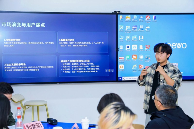 答辩现场,各创业团队依次登场,带来了涵盖营销策划、科技、校园服务等多个赛道的创新构想,亮点纷呈。其中,聚焦营销策划领域的项目,以健康产品为核心赛道,依托成熟供应链,精准布局江苏市场,通过专业策划与精准营销,推出贴合用户需求的健康产品;立足AI技术的科技类项目,瞄准化妆场景核心痛点,通过面部精准识别技术,实现智能试妆与专业教程指导双重服务;深耕校园场景的实干型项目,以羽毛球穿线服务为切入点,整合陪练教学、器材流通等优质资源,构建起完善的校园运动服务闭环。此外,关注青年深度思考的校园播客项目、专注电竞赛事服务的特色项目,凭借独特的市场视角、清晰的发展规划,也成功吸引了评委老师的重点关注与专业点评。