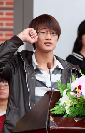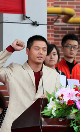 大学体育部王峰老师和土木工程学院张荣华同学分别代表裁判员和运动员宣誓。