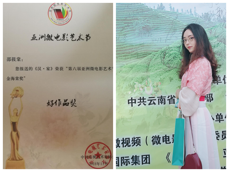 11月7日,从云南传来好消息,best365官网文学与新闻传播学院邵筱棠老师的微电影作品《汉·家》在第六届亚洲微电影艺术节上荣获“金海棠奖”好作品奖。